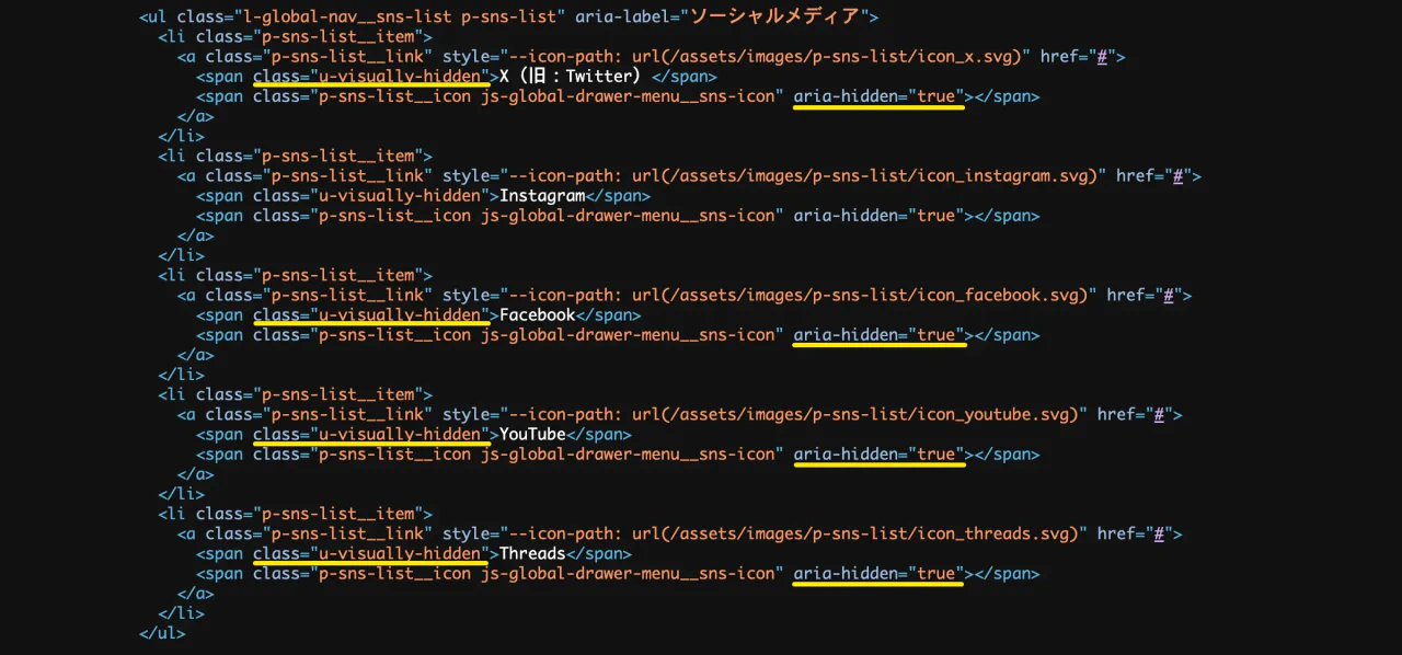 一方、アイコンや装飾的な要素など、読み上げが不要な部分については aria-hidden="true" を用いることで、支援技術から意図的に除外しています。