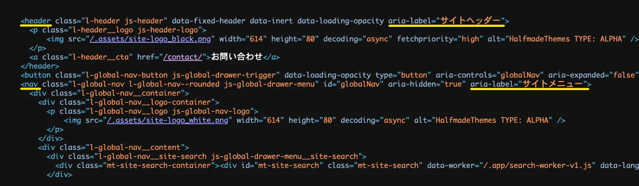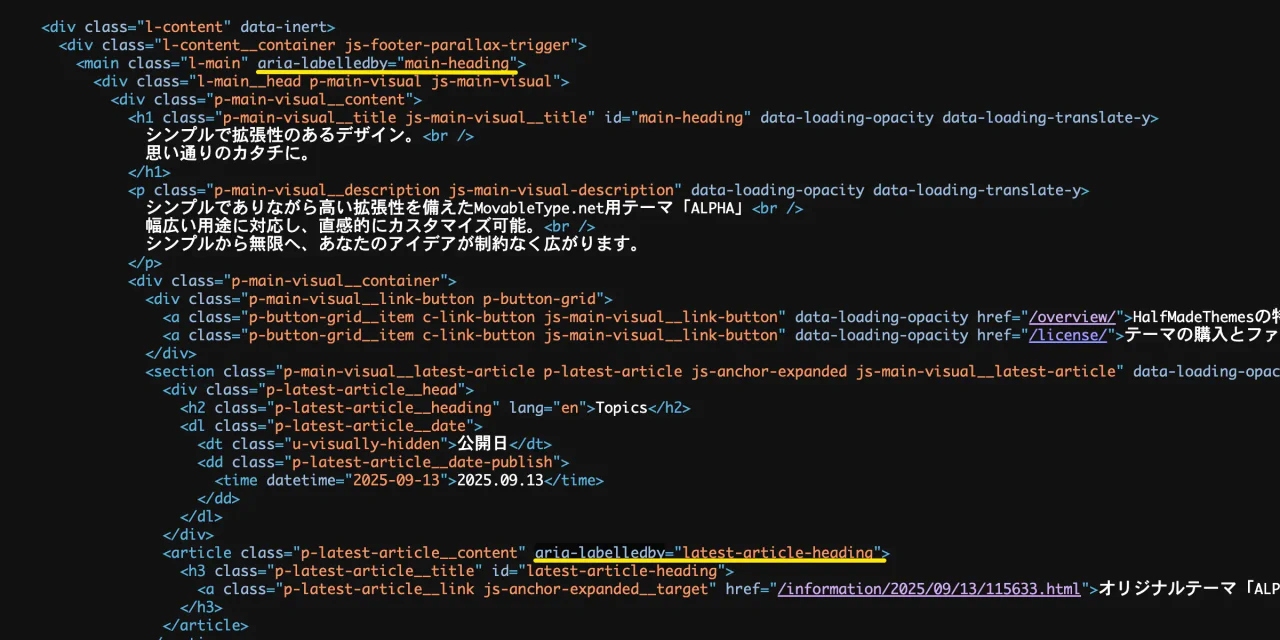 また、aria-label によって、それぞれのブロックに固有の名前を与えることで、複数の同種エリア(例えば複数の<nav>タグ)が存在する場合でも、混乱を避ける工夫がされています。