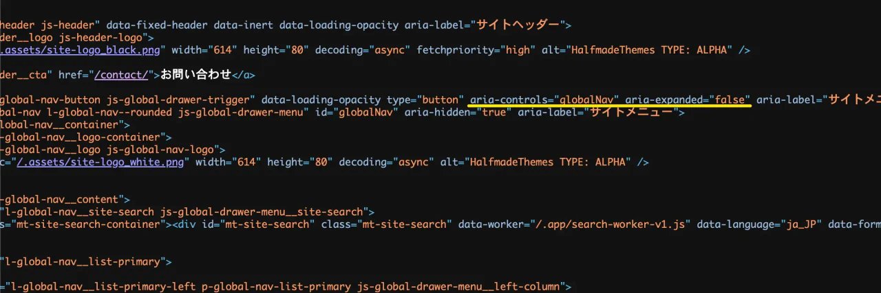 ナビゲーション部分では、開閉ボタンに aria-controls / aria-expanded 属性を指定しています。