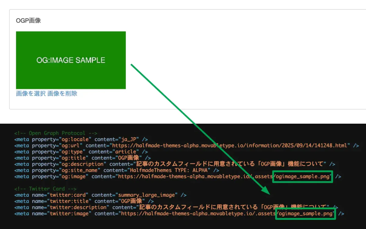 記事/ウェブページのカスタムフィールドにある「OGP画像」を利用して画像をアップロードした場合、その記事/ウェブページ固有のOGP画像としてHTML内に記載されます。