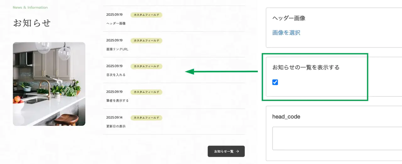 記事/ウェブページのカスタムフィールドにある「お知らせの一覧を表示する」をONにすると、記事/ウェブページの最下部にお知らせの最新記事を表示できます。