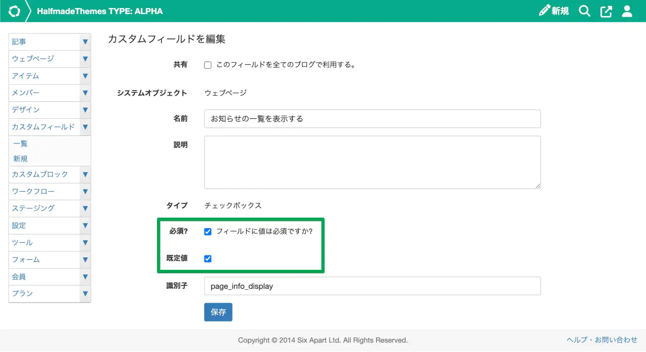 通常は記事毎にカスタムフィールドをONにしていく必要がありますが、カスタムフィールドの設定で「必須:ON」「既定値:ON」にしておくことで、各記事を作成する際は最初からONにしつつ、OFFにできないよう設定しておくことが可能です。