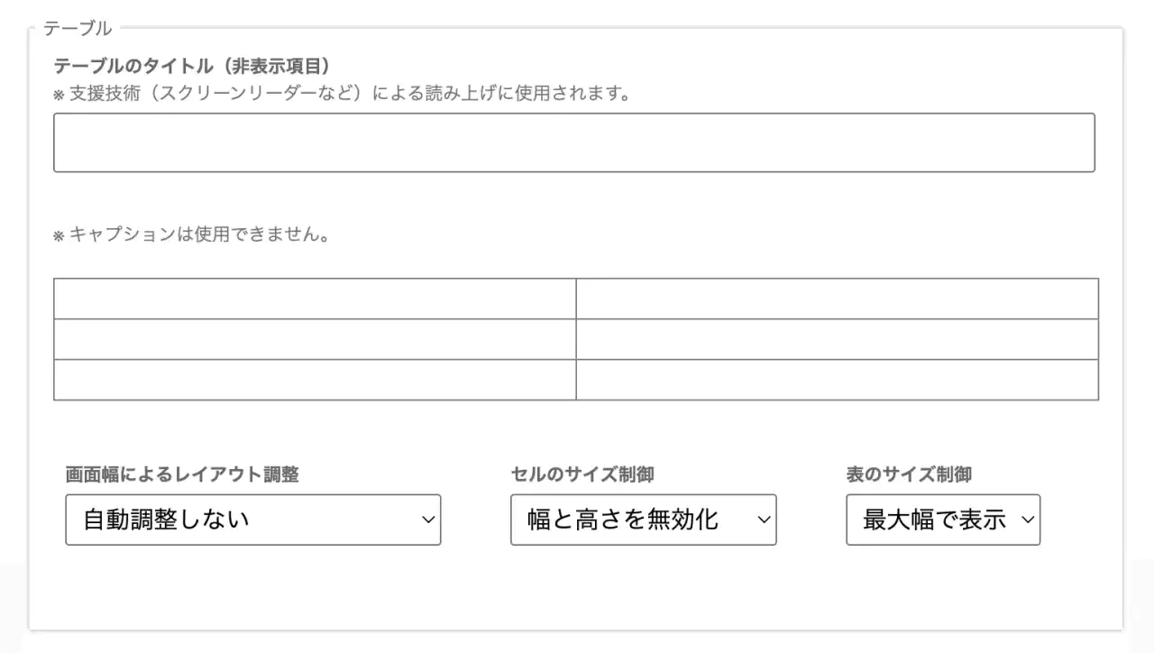 通常は表を内包する親ブロックの幅にあわせ表示されますが、表の内容(テキスト)にあわせて表示することも可能です。